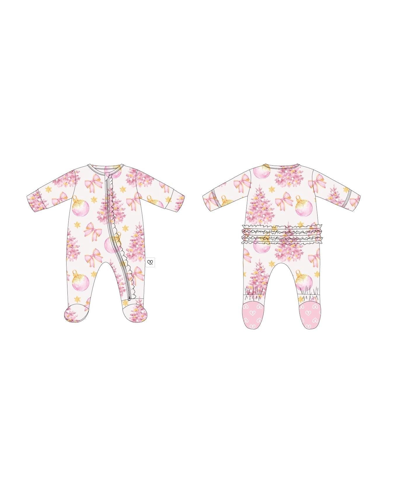 Dress your little one in cozy holiday charm with this adorable Lev Baby Kristina Ruffled Zippered Footie! Featuring festive pink holiday trees and precious ruffled details, this footie combines comfort with seasonal style. The convenient zippered design makes diaper changes and bedtime a breeze, while soft fabric keeps your baby snug and happy. Perfect for holiday photos, playdates, or just spreading festive cheer all season long!