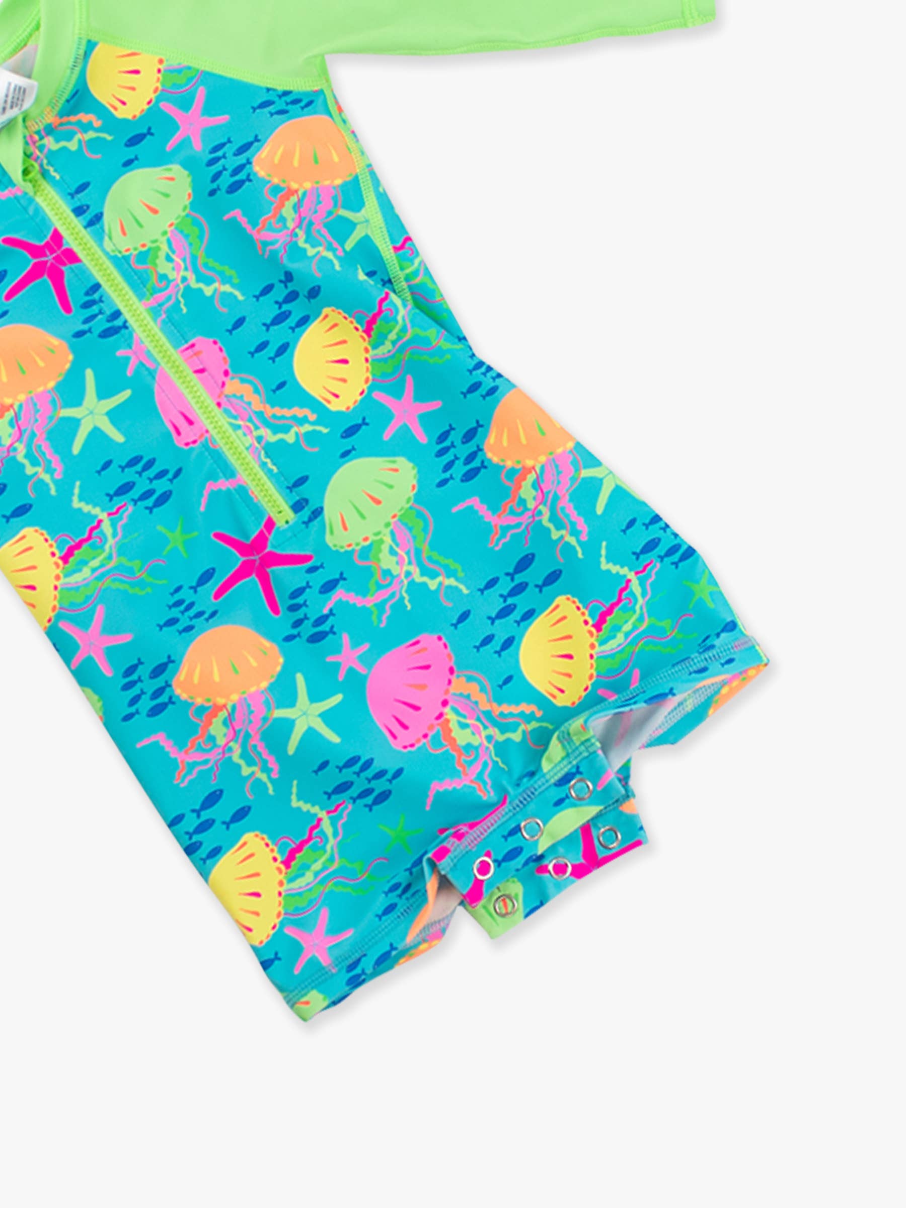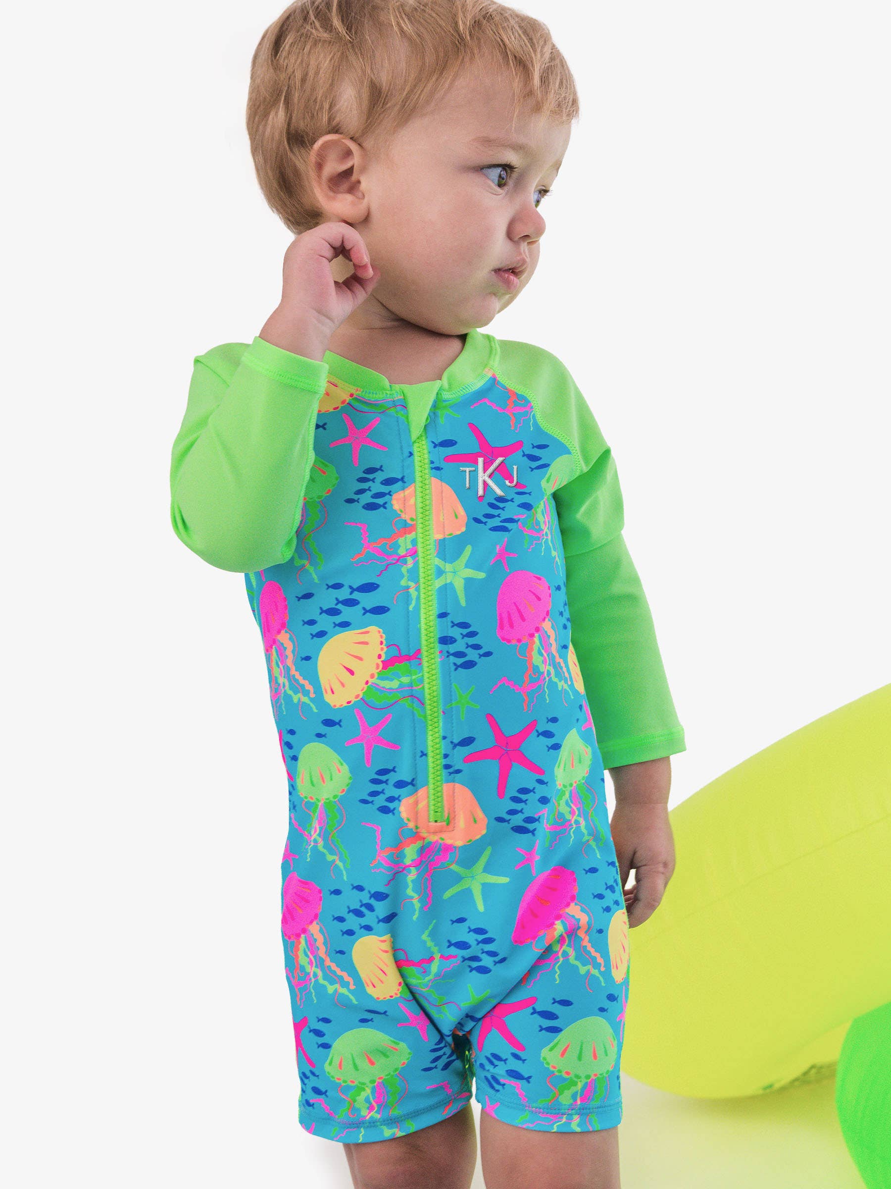 Keep your little guy safe from the sun with this UPF 50+ Boys Long Sleeve One Piece Rash Guard. This full coverage one piece suit makes trips to the pool, lake or beach so easy for little crawlers. Snaps at bottom make for easy changing. Made with sun protected fabric for all day protection and comfort. Colorful jellyfish swim across an ocean filled with marine life in this fun neon pattern! Pairs well with Bright Aqua, Neon Pink, Neon Magenta, Neon Honeydew, Neon Purple.