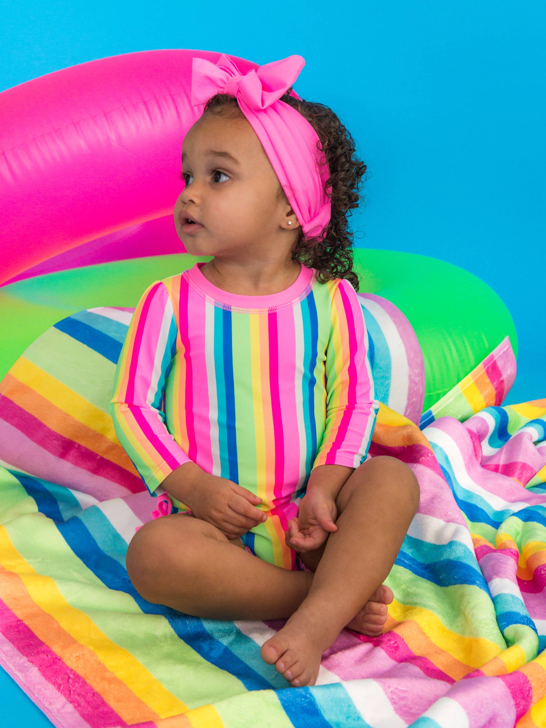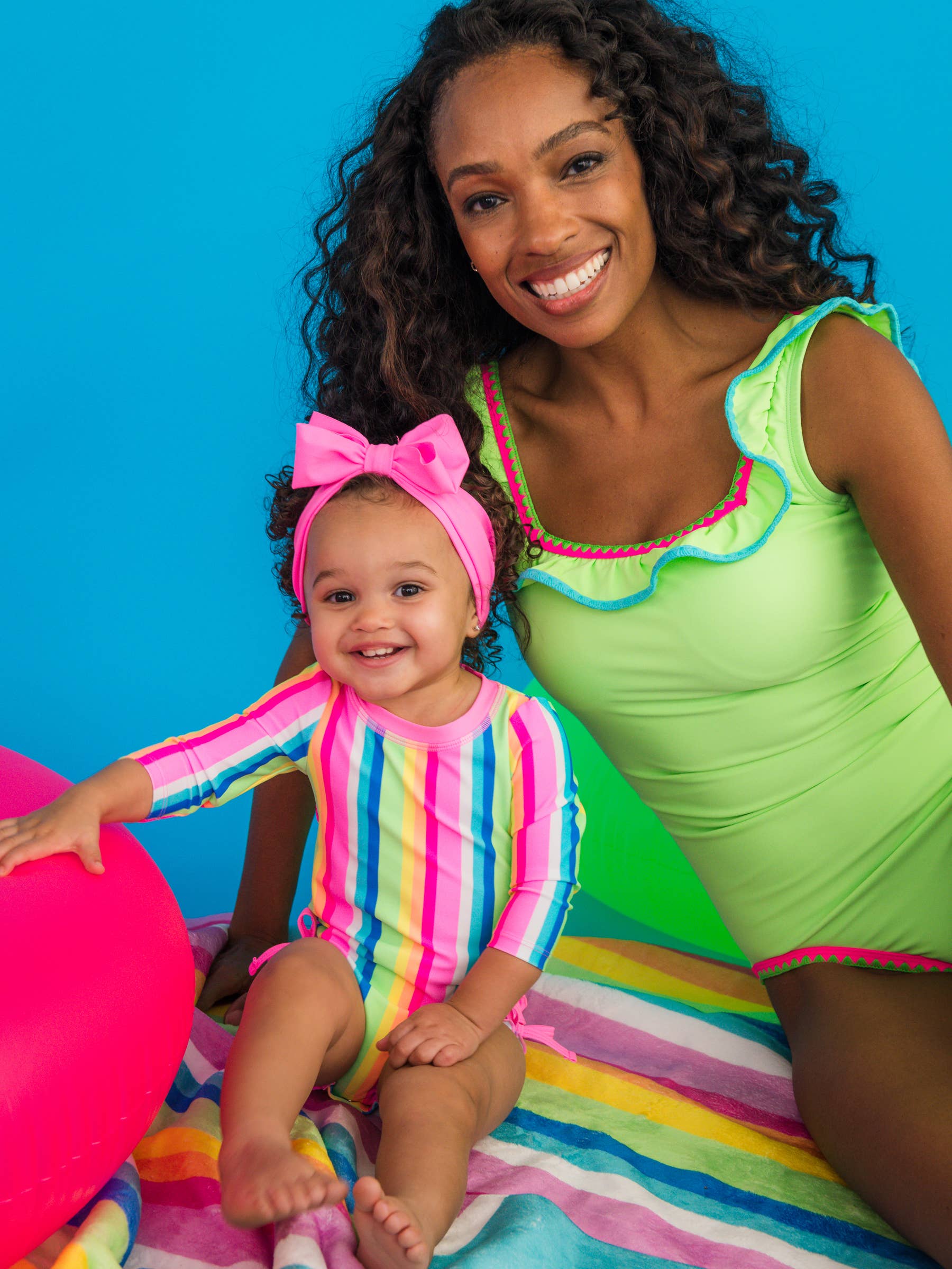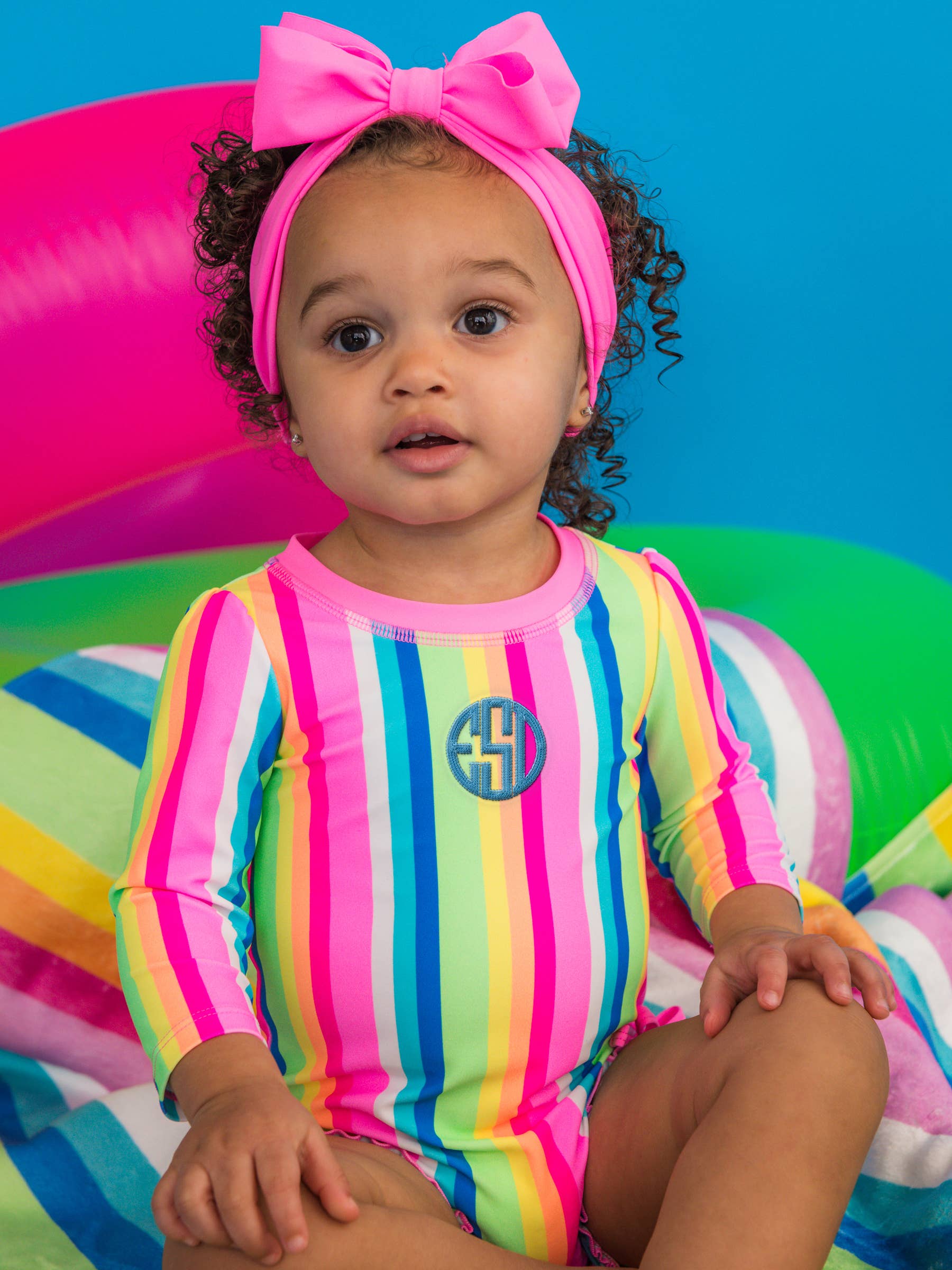A charming addition to your little girl's swimwear collection, this bestselling baby one-piece blends comfort, style, and sun protection effortlessly. Made from soft, UPF 50+ fabric, it offers all-day coverage and peace of mind under the sun. Designed with convenience in mind, it features a back zipper and bottom snaps for quick and easy changes. Thoughtful details like playful leg ruffles, sweet bow accents, and our signature rear ruffles add the perfect finishing touch to this adorable swimsuit. Bring the fun with this bold neon rainbow stripe print! Featuring vibrant vertical stripes in eye-popping colors, it’s a playful, high-energy design that’s perfect for kids who love to stand out and shine all summer long. Pairs well with Neon Orange, Neon Magenta, Bright Aqua, Neon Pink, Neon Honeydew, Neon Yellow.