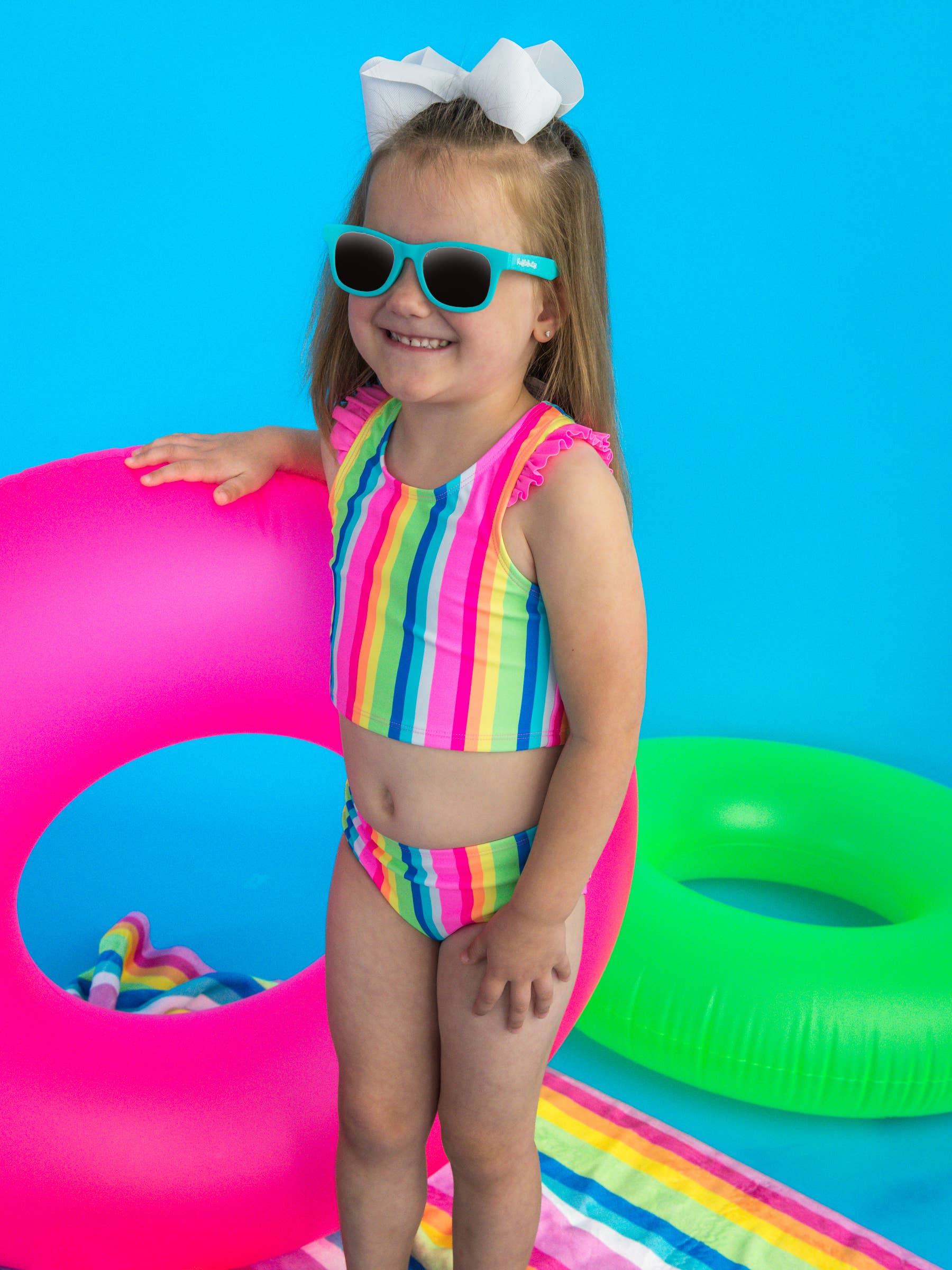 Make a splash with style and confidence in our Girls' Racerback Flutter Tankini. Featuring a playful flutter design and a sporty racerback, this two-piece set delivers UPF 50+ sun protection and moderate coverage, perfect for active days in the sun. Crafted from lightweight weight fabric, it provides a comfortable fit that’s made to move with her. Available in sizes up to 14, this tankini grows with her while offering a polished, ruffle-free bottom she’ll adore. Bring the fun with this bold neon rainbow stripe print! Featuring vibrant vertical stripes in eye-popping colors, it’s a playful, high-energy design that’s perfect for kids who love to stand out and shine all summer long. Pairs well with Neon Orange, Neon Magenta, Bright Aqua, Neon Pink, Neon Honeydew, Neon Yellow.
