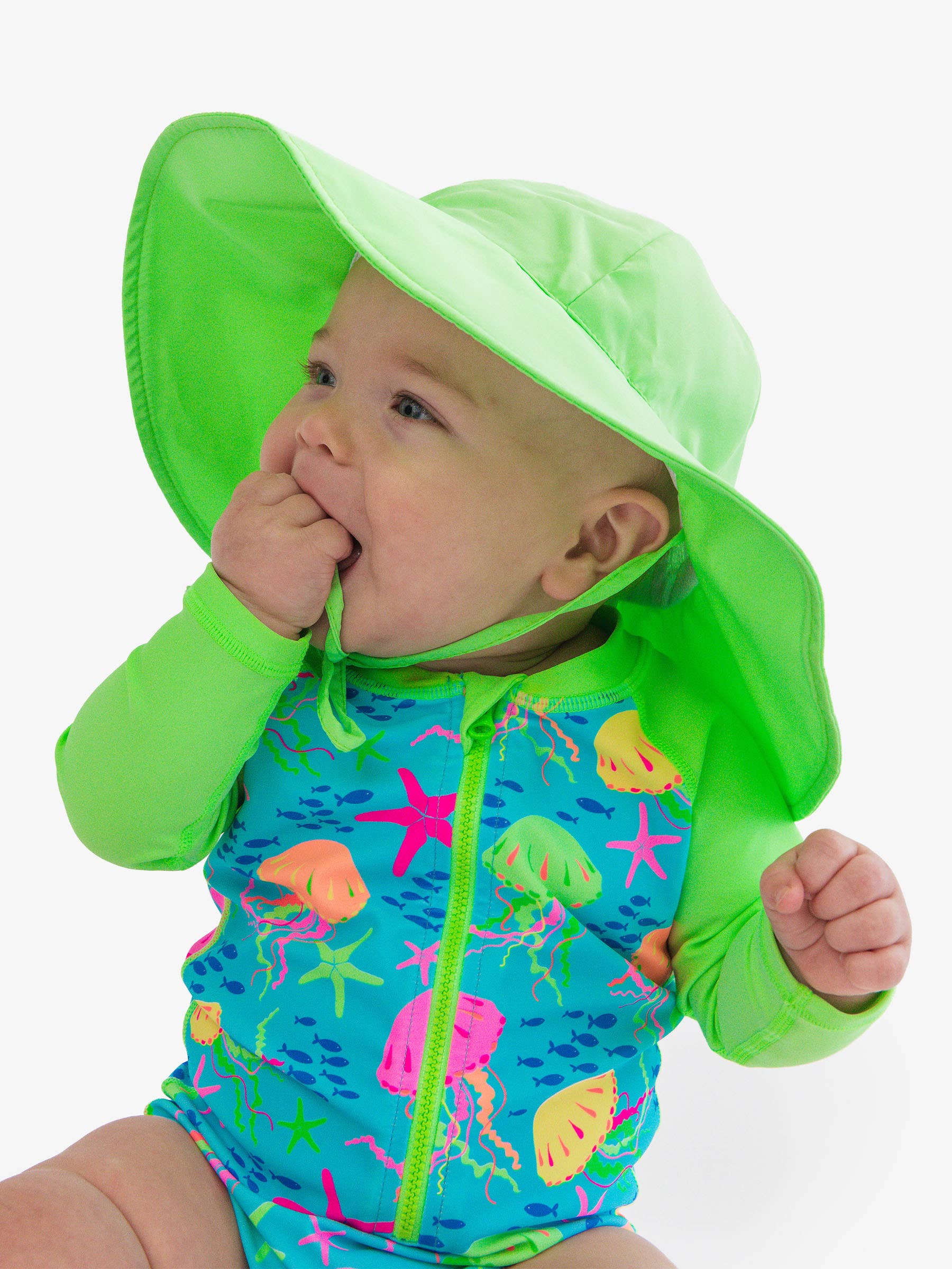 Keep them cool and protected from the sun's rays in this UPF 50+ sun protective hat for babies. Made of light-weight fabric and held secure with comfortable straps to tie under their chin, this baby sun hat is perfect for full days at the beach lake or pool! The vibrant neon color is bright and easy-to-spot! Pairs well with Neon Paisley Pop, Neon Pink Colorful Hearts, Neon Happy Hibiscus, Neon Turtle Tide, Neon Jelly Time, Neon Fin Friends.