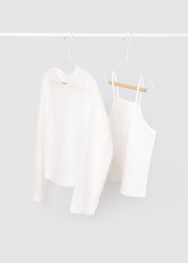Get ready to rock the style game with our Mayoral Textured White L/s w/ Undertank! This top features a chic textured design and comes with a coordinating undertank for a complete look. Perfect for any occasion, this top will keep you looking and feeling cool and confident! (Not to mention, it's super comfy too!) Grab yours now and stand out from the crowd!