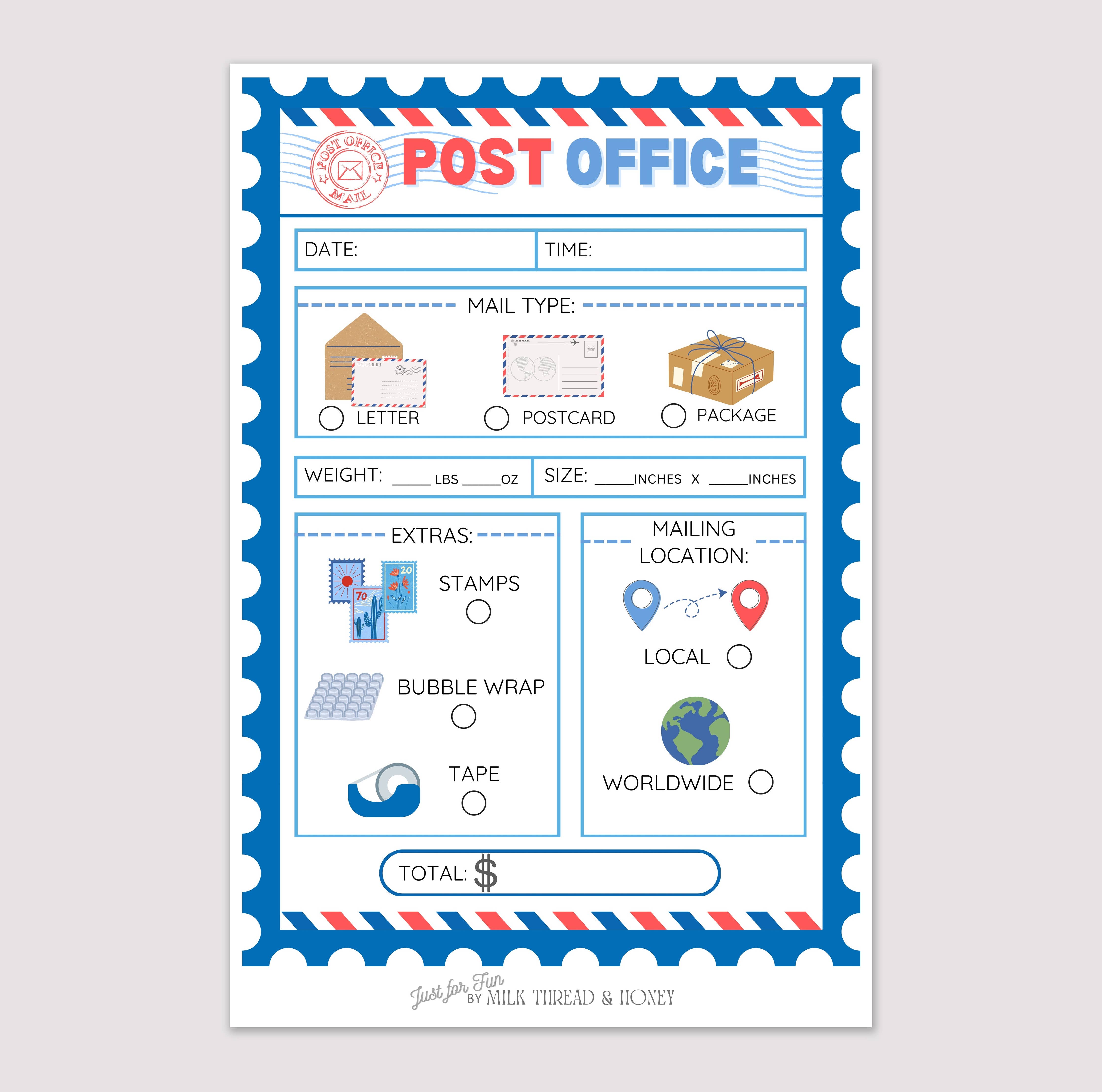 ✨ Features: • 25 tear-off pretend post office forms for kids’ pretend play • Easy-to-use format for writing date, time, and delivery details