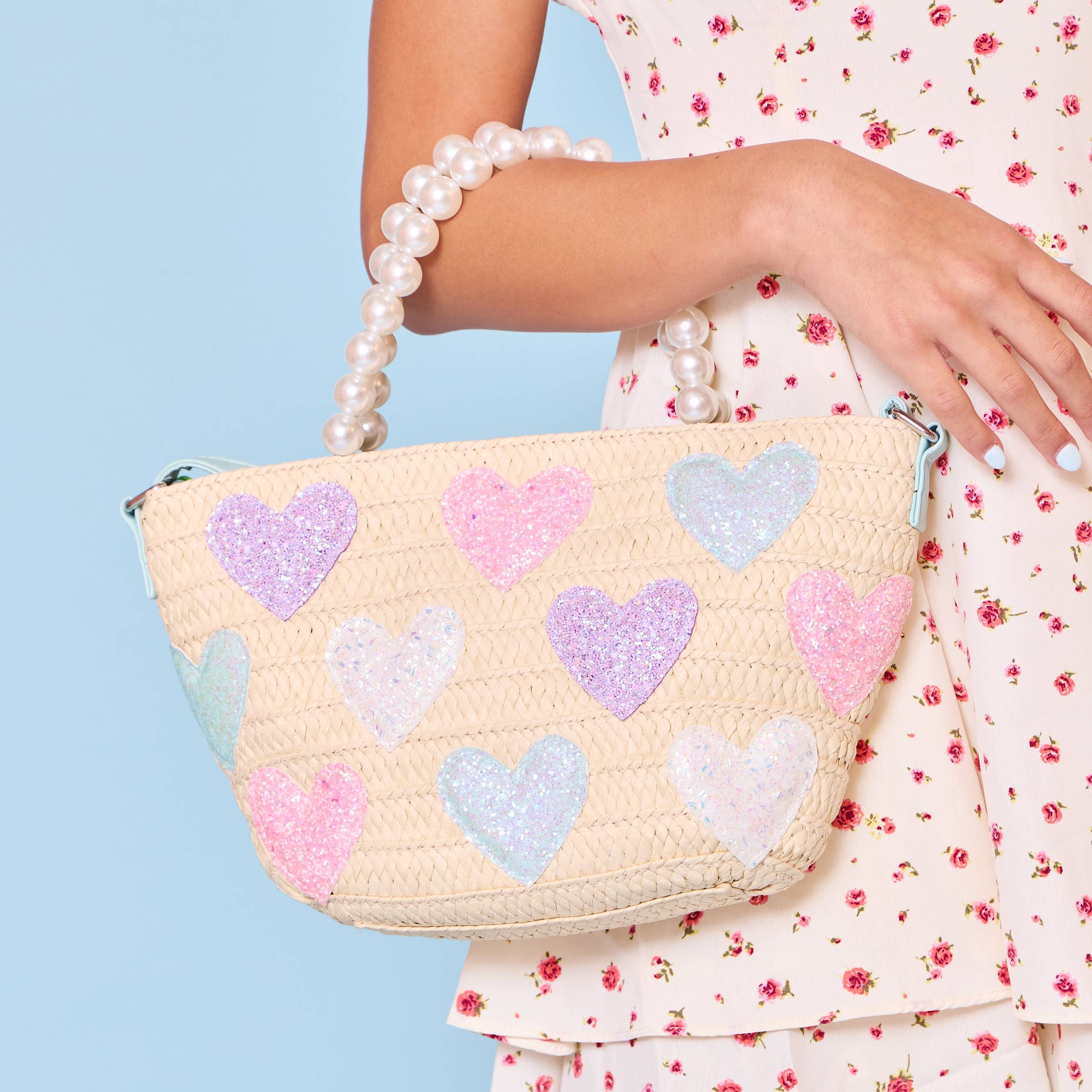 Achieve instant boho beachside style in this mini tote-shaped crossbody purse! With its straw exterior, pearl top handle, and glitter heart appliques, our latest resort-ready bag even includes an aqua blue crossbody strap. All that's missing for a top-notch beach babe look is your SPF and some sunnies!