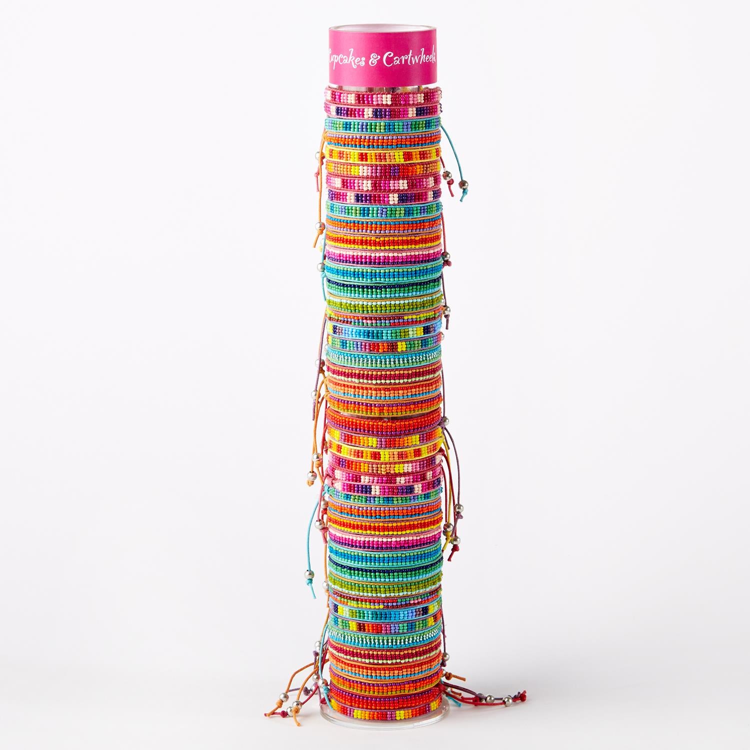 Colorful fun that doesn't end! These fun, bright bracelets are crafted with glass beads and have an adjustable strap so they can fit any wrist! The perfect gift for all ages.