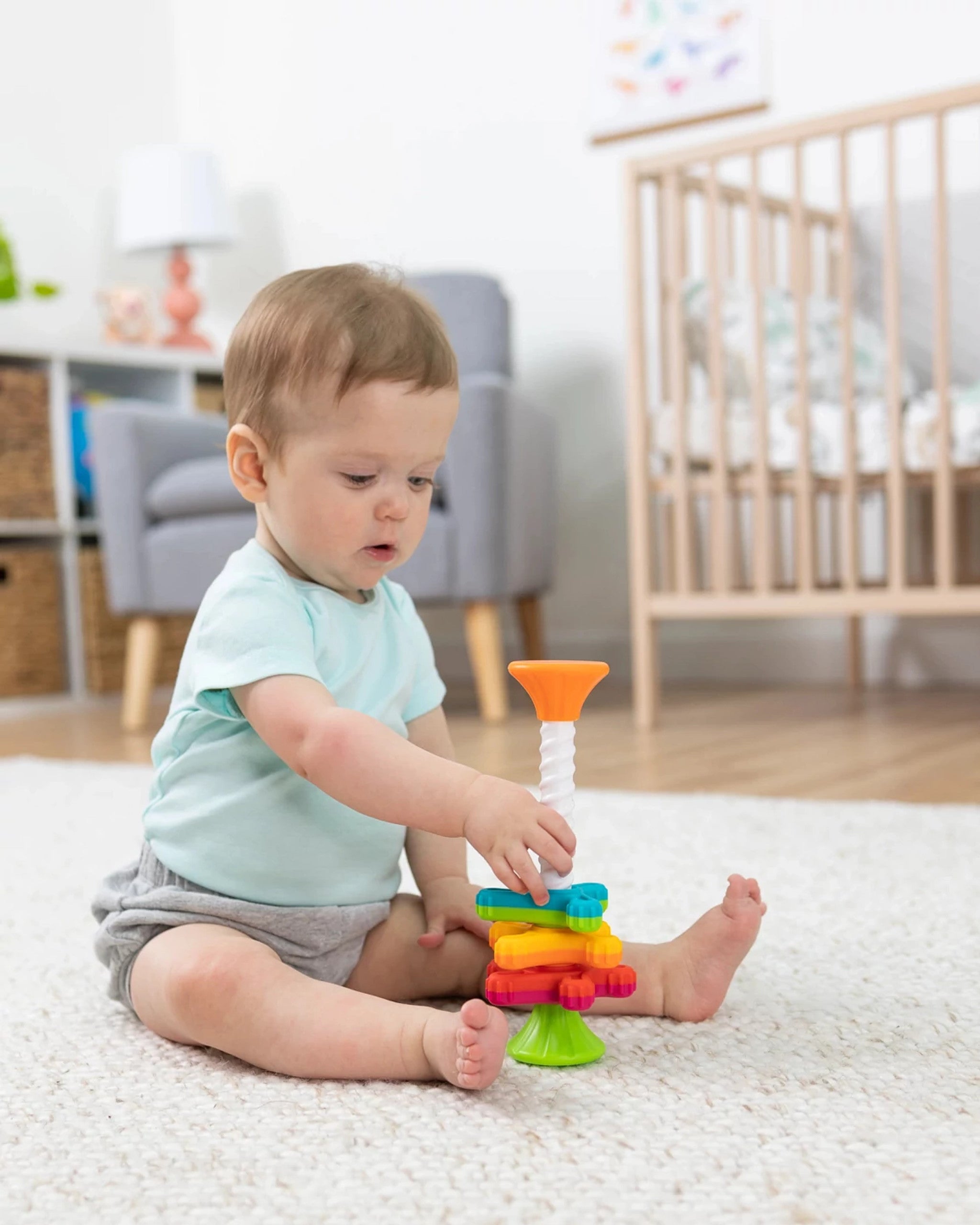 From reaching and grasping to exploring and even counting, the MiniSpinny is a go-anywhere sensory adventure that both stimulates and strengthens young growing brains.